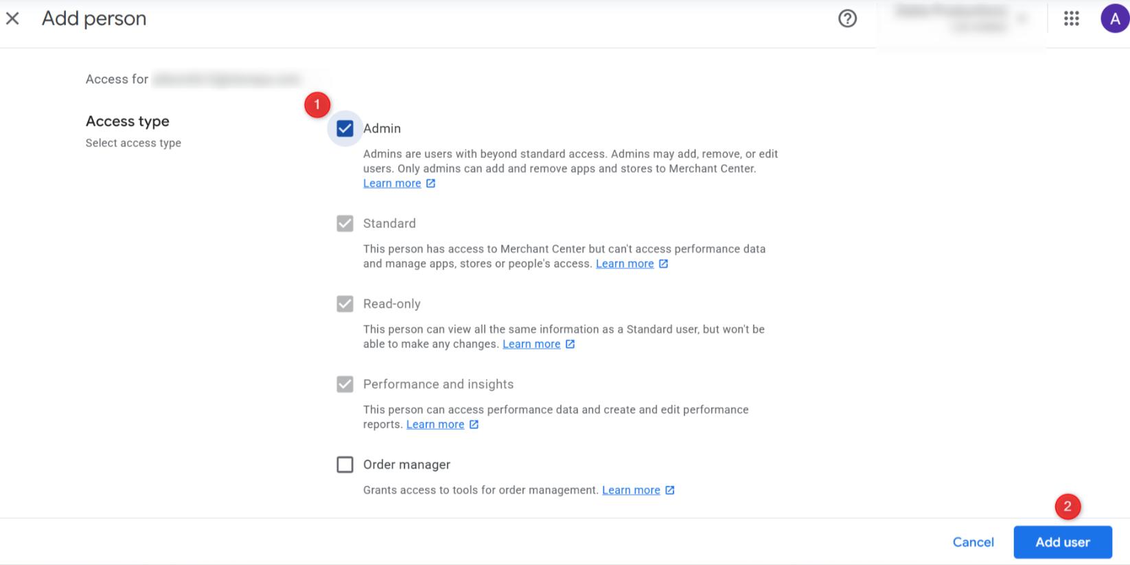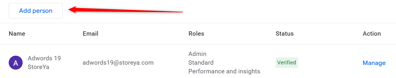 - Click on the "Add Person" and type in adwords12@storeya.com in the email address text field. Then click "Add user".