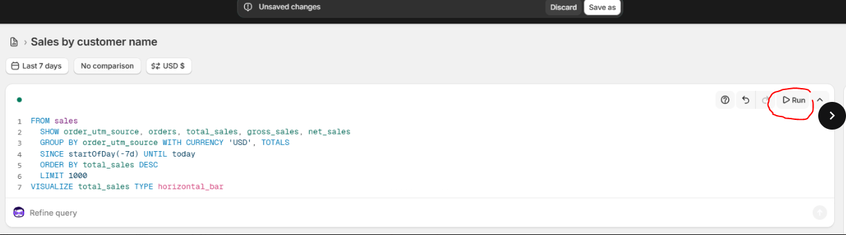 VISUALIZE total_sales TYPE horizontal_bar Once you’ve made the change, click the Run ▶ button (see below).
